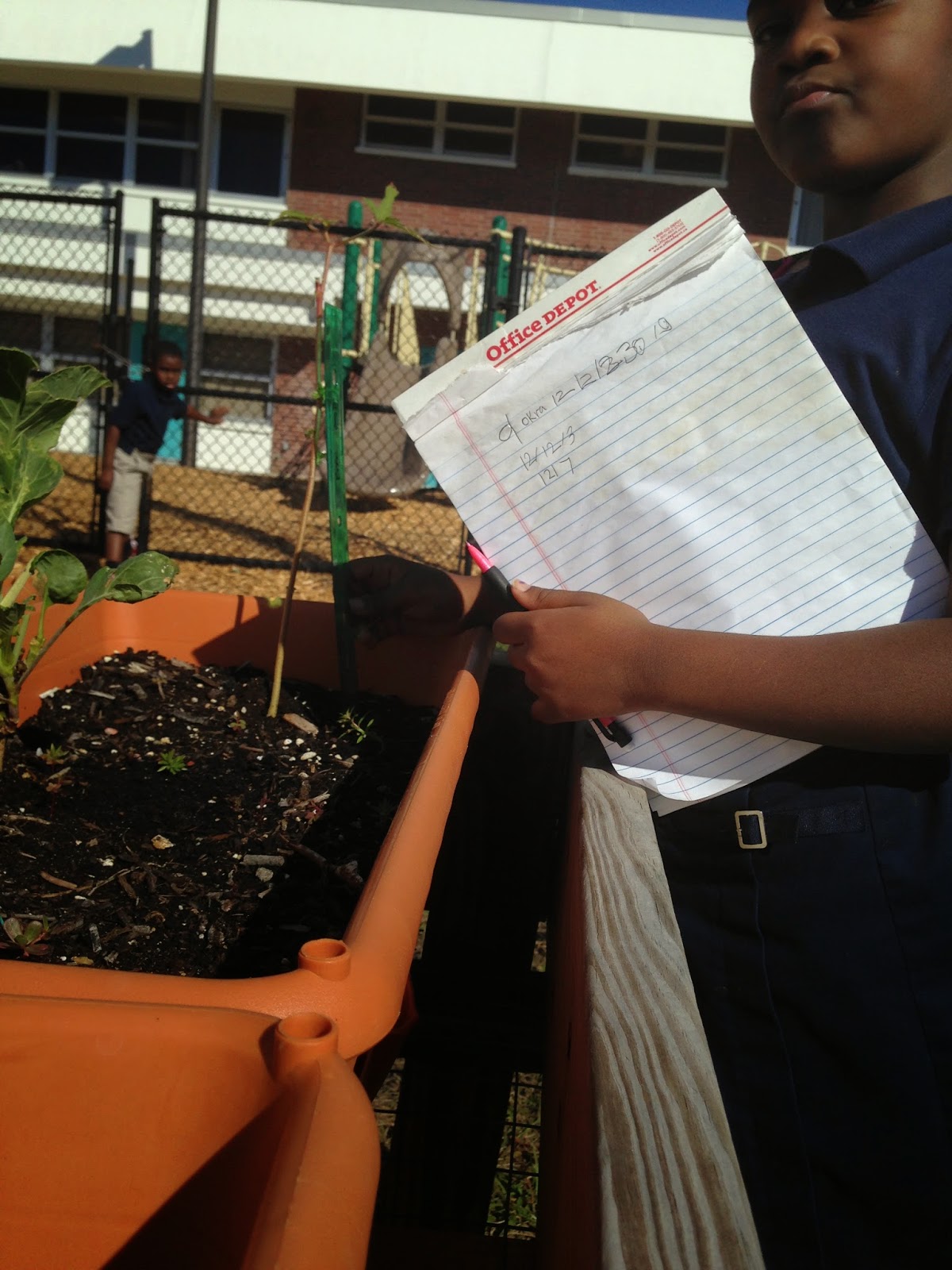 We were taking our measurements seriously. We first identified the plant, then took the ruler from the base of the plant to the top and had our students record the height in inches. Sam and I would write down the students' questions and we will return to them each week we have with them. The students were so enthusiastic about the proposed changes and what has already changed in the garden. They are especially concerned with when they can eat the leafy greens and okra.